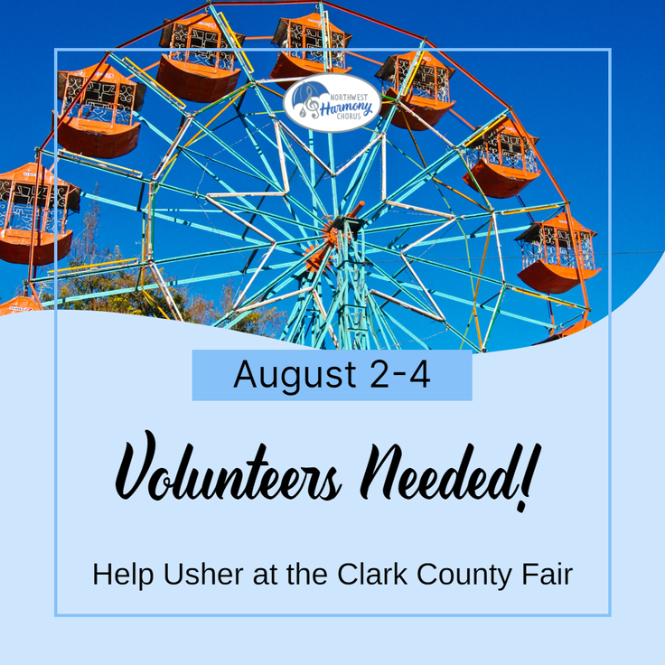 We are looking for volunteers to help our chorus setup chairs and usher at the Clark County Fair August 2-4. Volunteers receive a free parking pass and free fair admission! Enlist your friends and family! For more info and sign up visit here: https://www.signupgenius.com/go/70A0F4BABA928A2FC1-50199268-clark#/