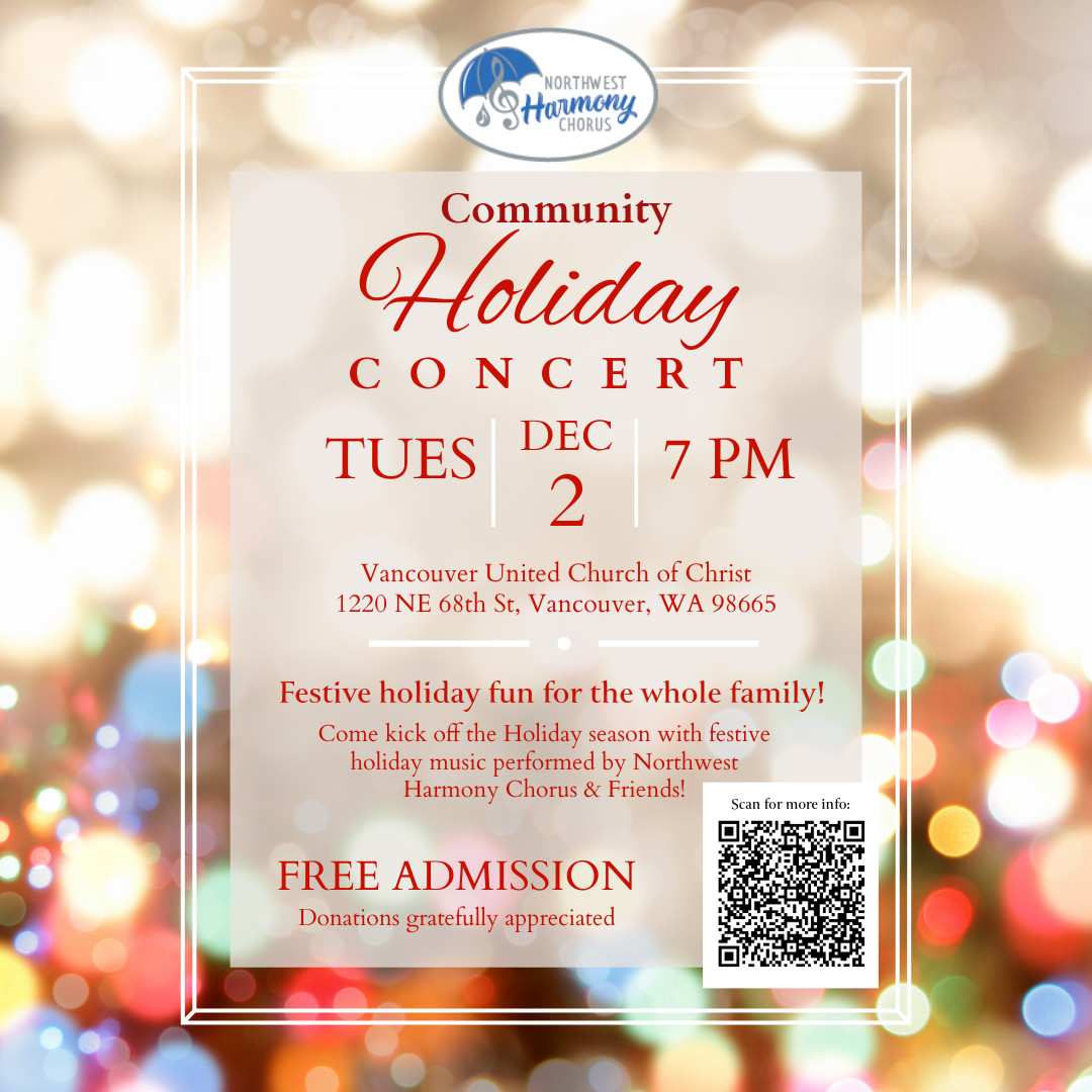 Come kick off the Holiday season with us as we perform Holiday Classics old and new! Festive fun for the whole family! FREE Admission. Good will offerings greatly appreciated. Tuesday, December 2 7:00 PM Vancouver United Church of Christ 1220 NE 68th St, Vancouver, WA 98665