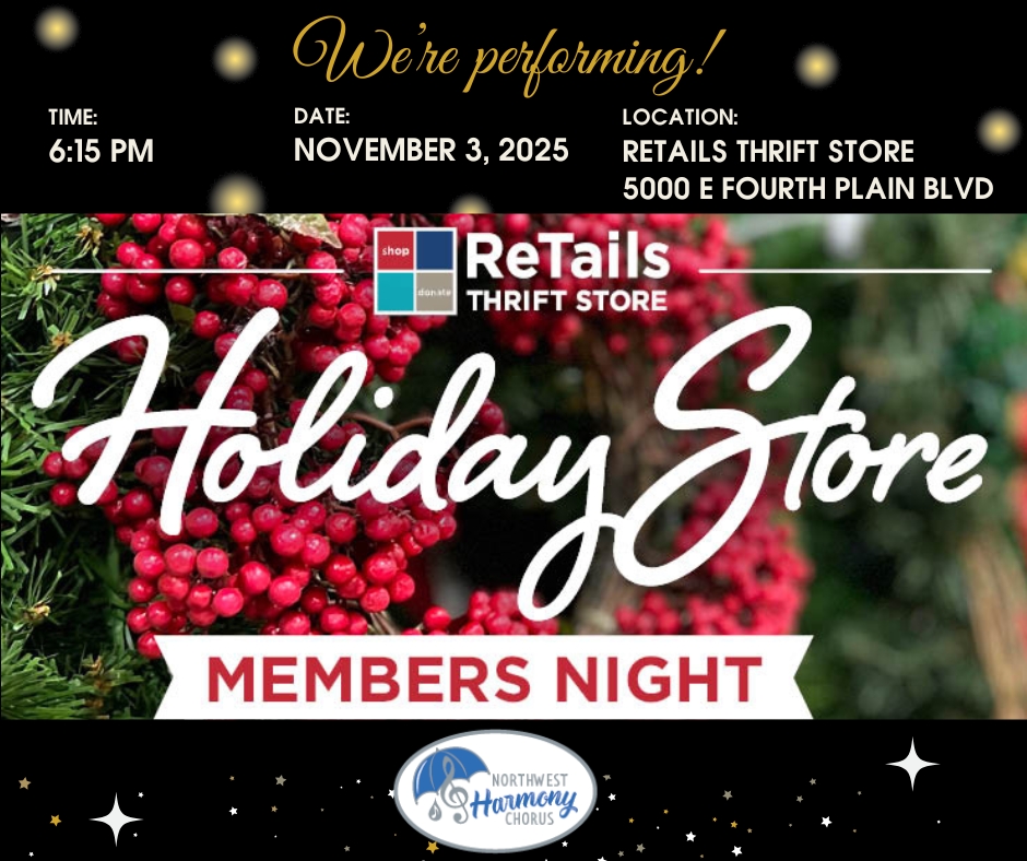Come sing with us for the Holidays! If you love singing holiday music as much as we do, come and join us for Holiday Chorus! Come learn more at our Kick Off Nights! September 22 and 29th - Come to one or both! 6:30 PM Northcrest Community Church 5602 E Mill Plain Blvd, Vancouver, WA […]