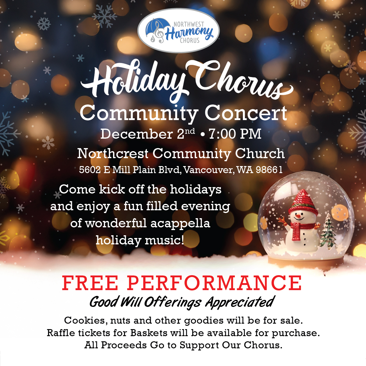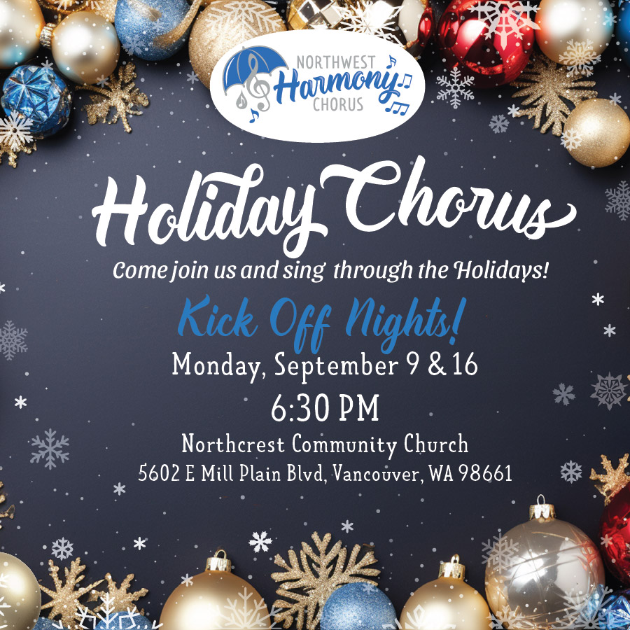 Northcrest Community Church Vancouver, WA, United StatesLet's Kick Off the Holiday Season together in the best way- with song! We invite all singers to come and join us and sing through the holidays as part of our Holiday Chorus! Together we create music, laughter and harmony as we learn Holiday songs together and perform them around the community! Bring your friends! […]