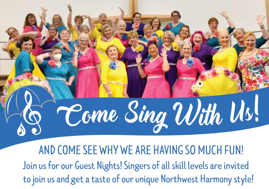 Come and Sing with Northwest Harmony Chorus and see why we are having so much fun! Whether you are any experienced singer or a shower singer extraordinaire we would love for you to come and get a taste for our special Northwest Harmony flavor! Come for a unforgettable night of meeting new friends, learning new skills and of course MUSIC, SINGING and FUN! Invite your friends! We can’t wait to meet you!