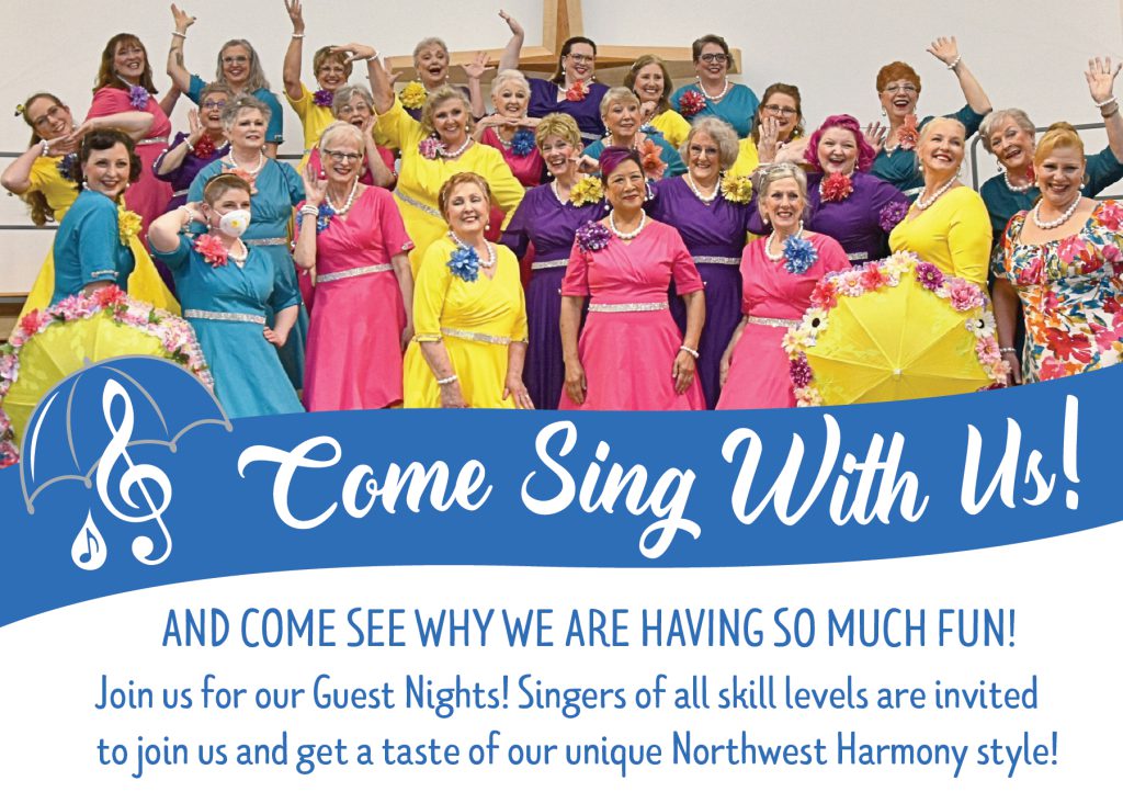 Come and Sing with Northwest Harmony Chorus and see why we are having so much fun! Whether you are any experienced singer or a shower singer extraordinaire we would love for you to come and get a taste for our special Northwest Harmony flavor! Come for a unforgettable night of meeting new friends, learning new skills and of course MUSIC, SINGING and FUN! Invite your friends! We can’t wait to meet you!