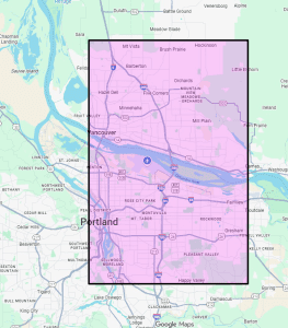 If your recipient is approximately in the bounds of the pink box below, which includes the Vancouver area and Northeast and Downtown Portland, we will come! (Outside the limits? Consider our virtual valentine option. Not sure if you qualify? Send us a question and we’ll let you know!)